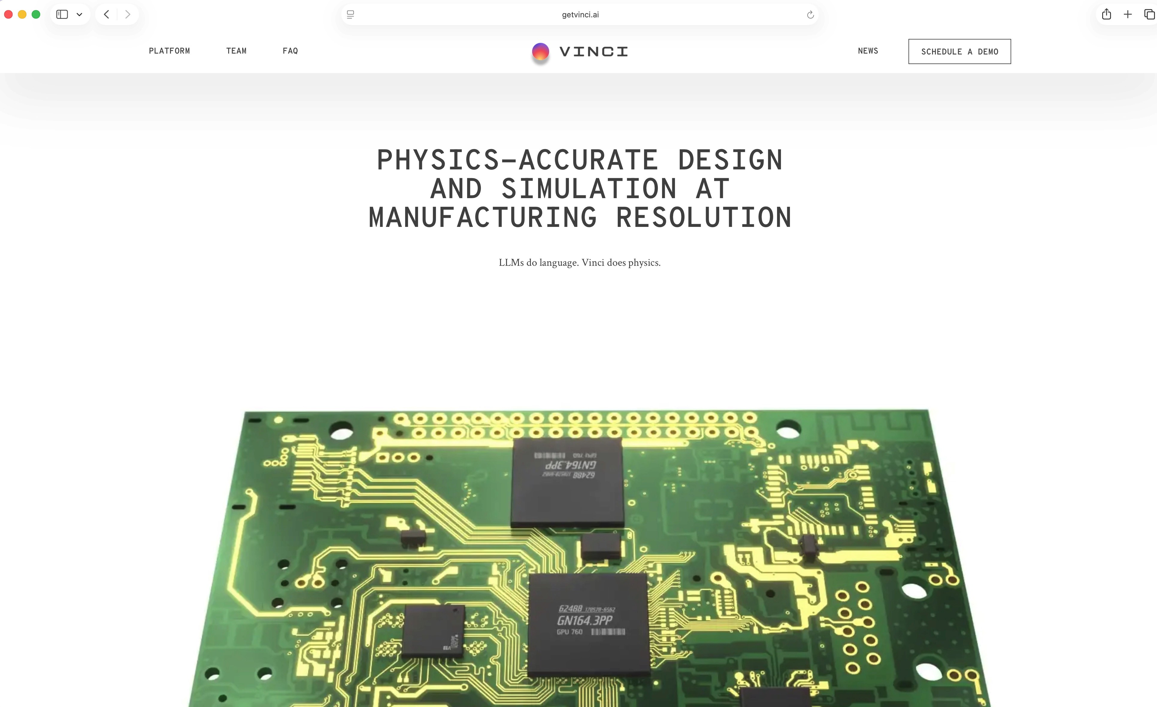 Vinci built a revolutionary AI-powered, physics-based foundation model that runs full-fidelity engineering simulations at manufacturing resolution, with no meshing, no approximations, accurate down to the nanometer. Validated by over half of the top 20 semiconductor companies, the platform delivers solver-grade accuracy up to 1000x faster than traditional FEA tools, enabling a single engineer to do the work that, until Vinci, required entire teams.
