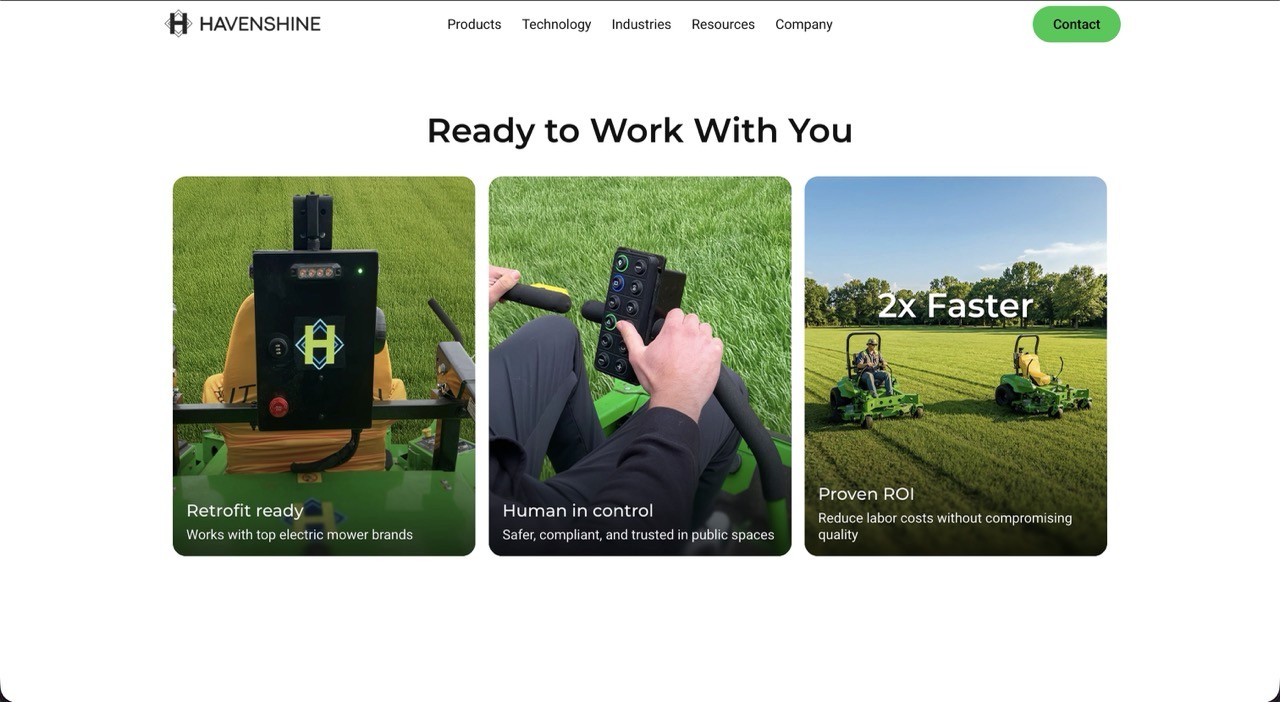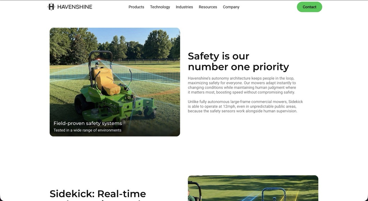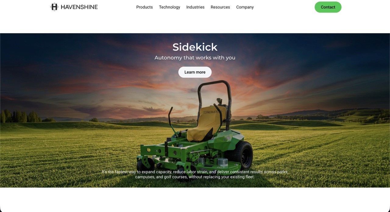 Havenshine brings practical autonomy to professional grounds care. Their Sidekick system retrofits onto existing commercial mowers, letting a single operator manage multiple machines safely and efficiently, doubling productivity without replacing existing fleets.